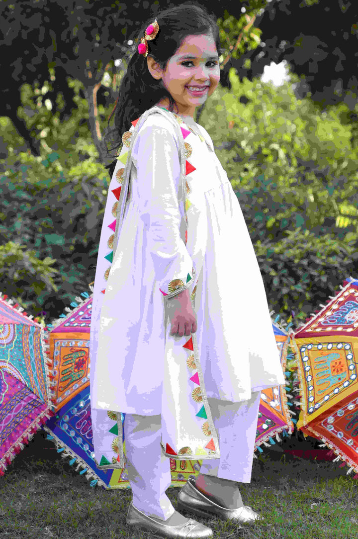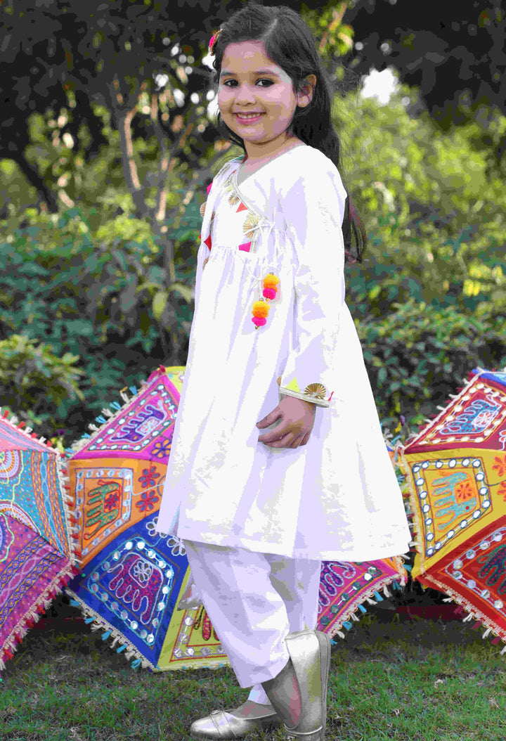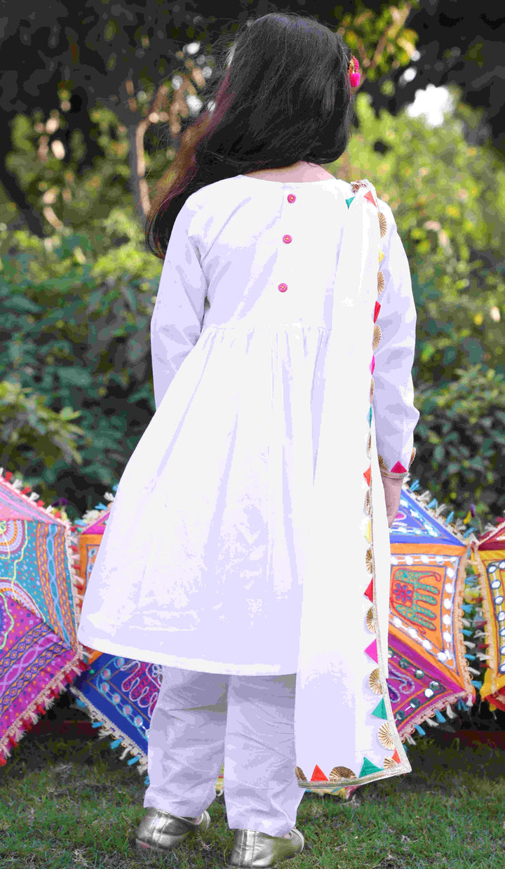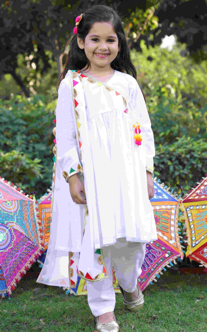 Girls Pure Cotton White Angrakha Kurta Set with Pant & Dupatta